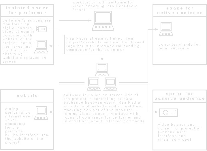 The audience - using Internet connected computers, defines and sends commands for the performer, who observes them on the screen, interprets and executes. Her actions are observed in the preview widow on the www page.