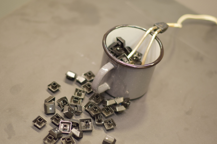 After entering the web address in the device, its screen begins to pulsate with steady light - synchronously with the lamp standing on the table, which also begins to flash with light when it detects at least one recipient (someone who has loaded the website on their device). The device also emits a sound. If there are more recipients in the installation space using their mobile devices, their light and sound pulses remain synchronized, creating a momentary, intimate audio and light environment around the table. At the same time presence of recipients turns on the power supply to the heater, which begins to melt the keys - the keys slowly dissolve into a uniform mass devoid of both internal distinctions and meanings. The installation idea is a synthesis of several threads: the story leading to the recent arrest of Julian Assange of some elements of the life of Richard Francis Burton (freethinker, orientalist, linguist and swordsman, the first European who reached Lake Tanganyika, translator of "Arab Nights" into languages European and the author of the original poetic text "The Kasîdah of Hâjî Abdû El-Yezdî" [written of course under the pseudonym Hâjî Abdû El-Yezdî]); and the scientific achievements of Muhammad ibn Musa al-Khwarizmi (a Persian mathematician from whose name the word "algorithm" comes from). The installation deals with functioning in isolation, in contrast to the mainstream and the social status quo (and even about the social gag imposed on individuality), as well as about communication discontinuity, but also the possibility of silent mutual understanding over cultural and semiotic barriers. Tanganyika: Al-Khwārizmī, Burton, Assange: susceptive interpassive object by Paweł Janicki: cooperation: Klementyna Jankiewicz, Karol Nowak The work was premiered during "The Matter of Code" exhibition (a part of the Gdynia Design Days Festival, 6-14 July 2019, Poland) curated by Wiesław Bartkowski. video: Szymon Pepliński
